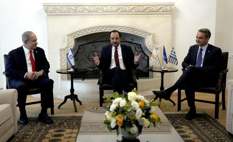 Israel vertieft seine Sicherheitskooperation mit den Mittelmeernachbarn Zypern und Griechenland. Dies sagte der israelische Ministerpräsident Benjamin Netanjahu nach einem Dreiergipfel mit seinem griechischen Amtskollegen Kyriakos Mitsotakis und Zyperns Präsident Nikos Christodoulidis in Jerusalem. „Die Bedrohungen, denen wir gegenüberstehen, sind real“, sagte Netanjahu bei einer gemeinsamen Pressekonferenz.
